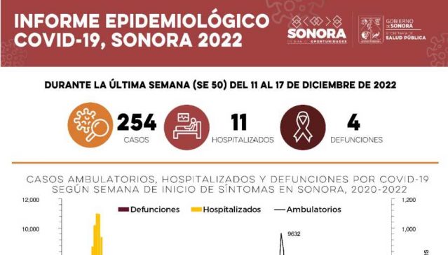 HERMOSILLO, SONORA. MX. — La Secretaría de Salud de Sonora (SSA) confirmó 254 nuevos casos de Covid-19 y cuatro defunciones por la enfermedad, en la semana epidemiológica 50, que abarca del 11 al 17 de diciembre.