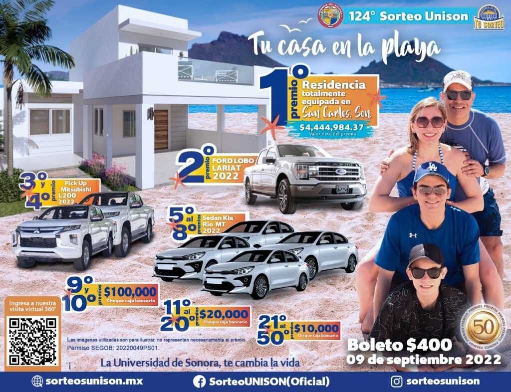 HERMOSILLO, SONORA. MX. ═ Una residencia totalmente amueblada y equipada en San Carlos con un valor de casi 4.5 millones de pesos es el primer premio de la edición 124 del Sorteo Unison “Tu casa en la playa”, además de siete automóviles y cheques de caja.